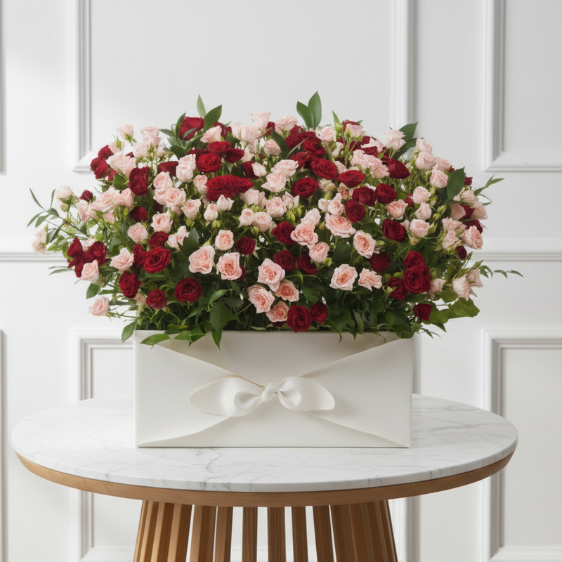 Our exquisite Box Arrangement boasts 50 Baby Roses gracefully arranged with lush Ruscus greens. A timeless gift that symbolizes love, beauty, and elegance.