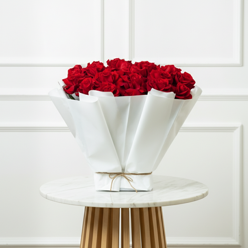 A timeless standing bouquet featuring 25 roses in a foam base, elegantly wrapped in Beige paper. Perfect for weddings, memorials, or sophisticated events, this design combines purity with structural elegance for a lasting impression.