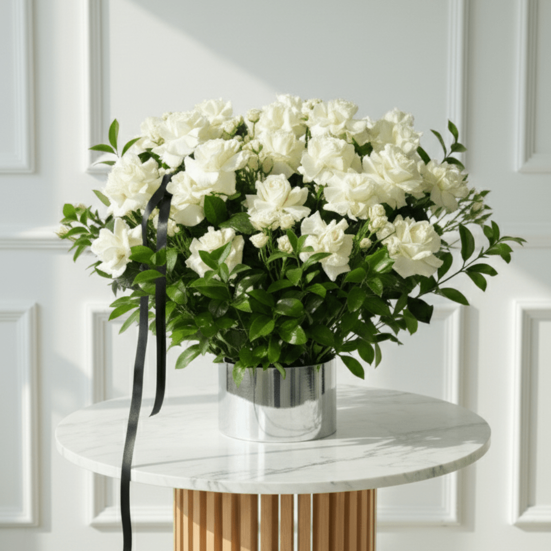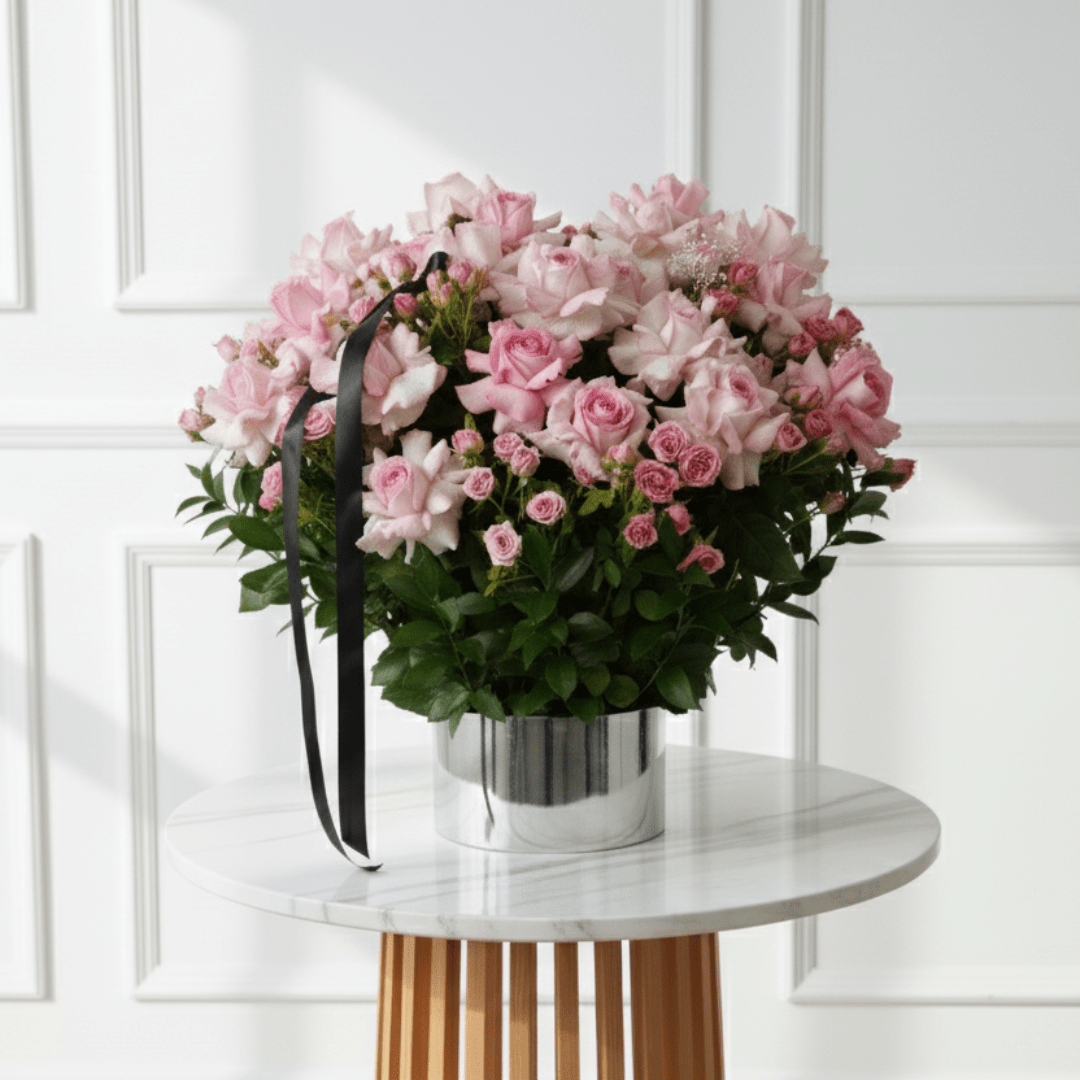 An exquisite box arrangement featuring 25 pink roses and 20 pink baby roses, elegantly styled with lush ruscus in a sleek silver box. This luxurious creation radiates grace and sophistication, making it the perfect gift for celebrating love, beauty, and timeless elegance.