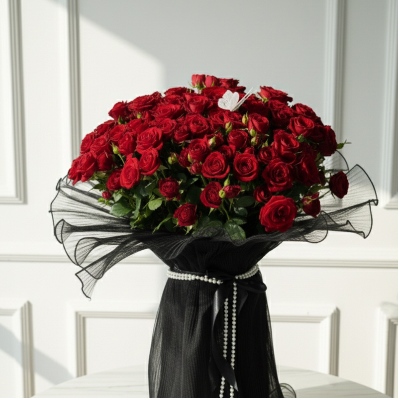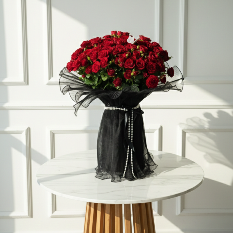 Ignite the senses with 30 premium red spray roses, crown-set for a lush, velvety texture. Artfully wrapped in pleated black net fabric and cinched with a shimmering pearl strand, this high-contrast masterpiece offers a sophisticated, avant-garde silhouette for an unforgettable Valentine’s statement.