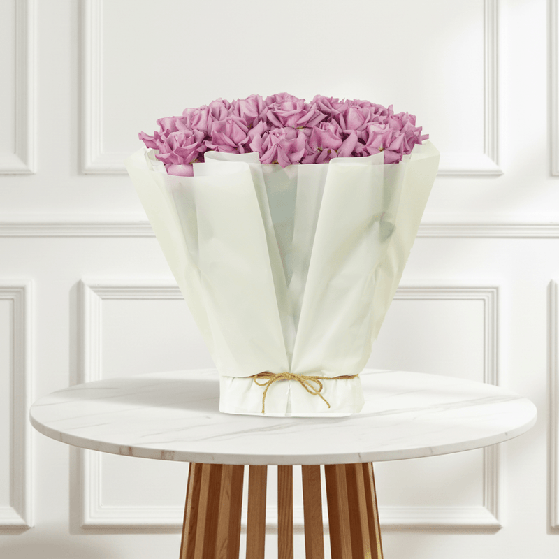 A timeless standing bouquet featuring 25 pristine white roses in a foam base, elegantly wrapped in cream paper. Perfect for weddings, memorials, or sophisticated events, this design combines purity with structural elegance for a lasting impression.