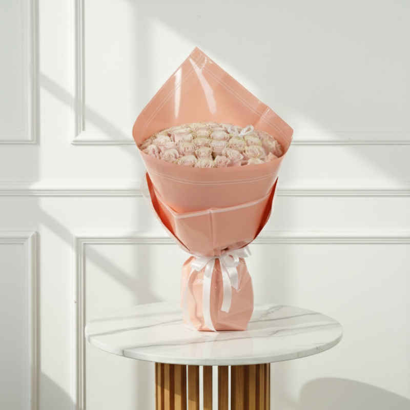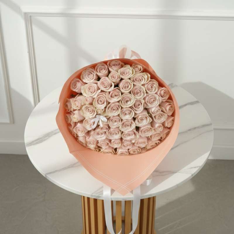 Fifty exquisite, tightly-budded light pink roses create a stunning, voluminous dome. Expertly wrapped in soft peach paper and finished with ribbons, this opulent bouquet is the ultimate expression of unforgettable grace and adoration.