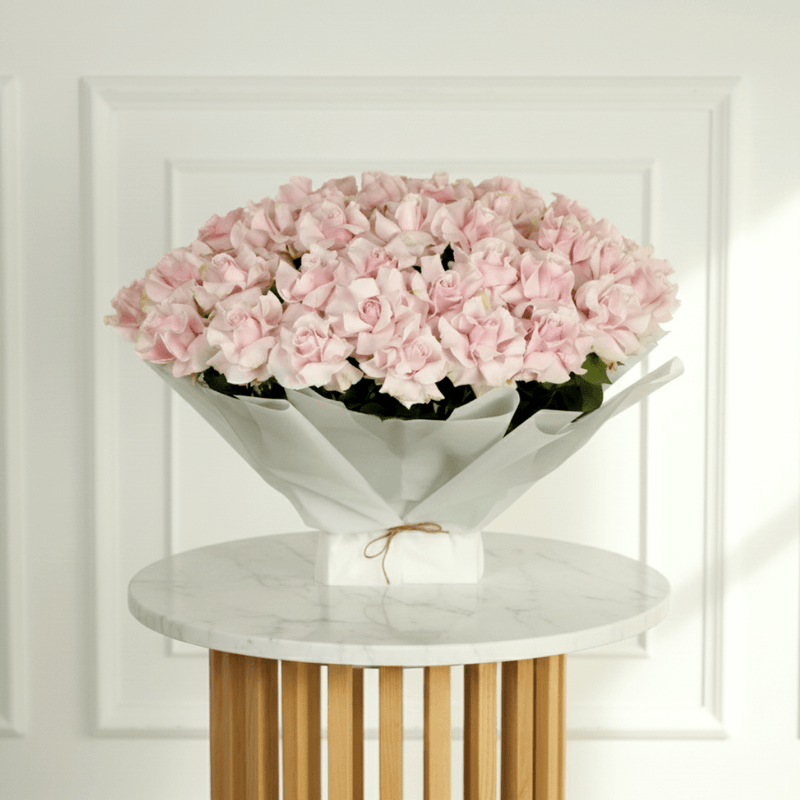 Indulge in the elegance of our Standing Bouquet, featuring 50 exquisite pink roses with opened petals, expertly arranged in a foam bouquet and wrapped in crisp white paper, perfect for grand gestures and special occasions.