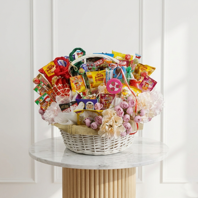 Celebrate tradition with this vibrant white wicker basket, overflowing with a curated selection of premium chocolates, biscuits, and colorful lollipops. Artfully accented with delicate spray roses and traditional motifs, this festive arrangement is the perfect, joyful gift for sharing sweetness during the Garangao festivities.
