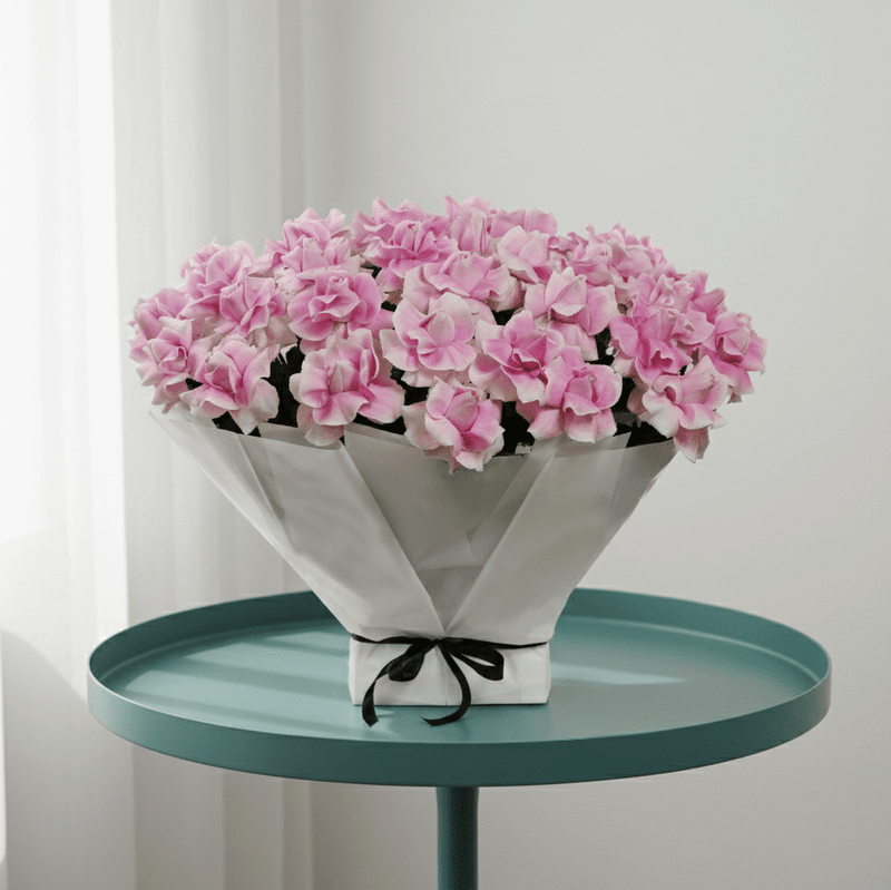Indulge in the elegance of our Standing Bouquet, featuring 50 exquisite pink roses with opened petals, expertly arranged in a foam bouquet and wrapped in crisp white paper, perfect for grand gestures and special occasions.