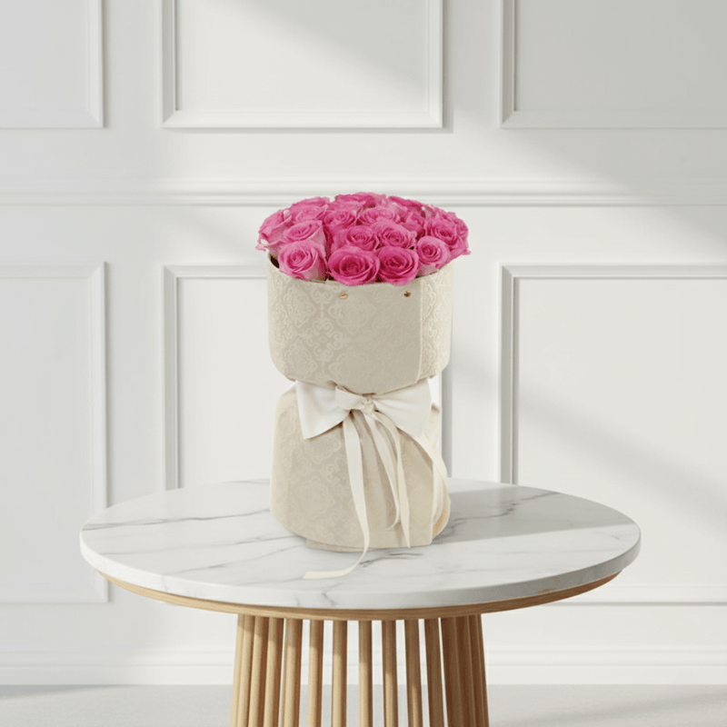 encapsulates timeless elegance with twenty-five resplendent roses in varying shades of amber . Arranged with skillful precision within a vintage-style bouquet and tied with a graceful ribbon, this hand bouquet radiates warmth and nostalgia, perfect for a sophisticated and heartfelt gesture.