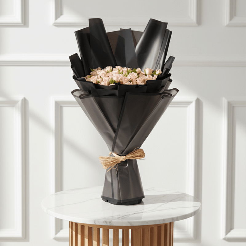 This lovely bouquet of 20 spray roses is the perfect way to show your appreciation, friendship, or sympathy. The delicate and soft color of the roses is complemented by the sleek and dark wrap, creating a stunning contrast. This bouquet is suitable for any occasion, such as thank you, get well, or congratulations.