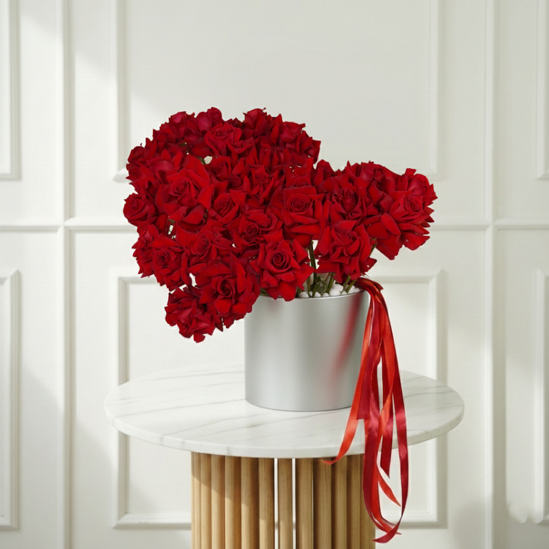 30 premium red roses are masterfully arranged in a dense, opulent display within a sleek silver box. This grand gesture of passion combines classic romance with modern sophistication, creating a breathtaking sculpture of love that serves as an unforgettable centerpiece for your most cherished moments.